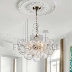 A statement chandelier that adds sophistication and creates a cozy, warm atmosphere in the dining room.