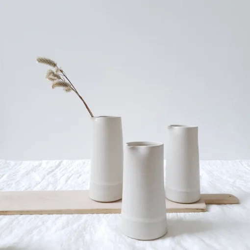 This tall ceramic pitcher doubles as a flower vase or water jug, featuring a sleek curved silhouette and glossy white glaze. Place it at the center of your dining table with fresh blooms or use it for serving drinks during dinner gatherings.